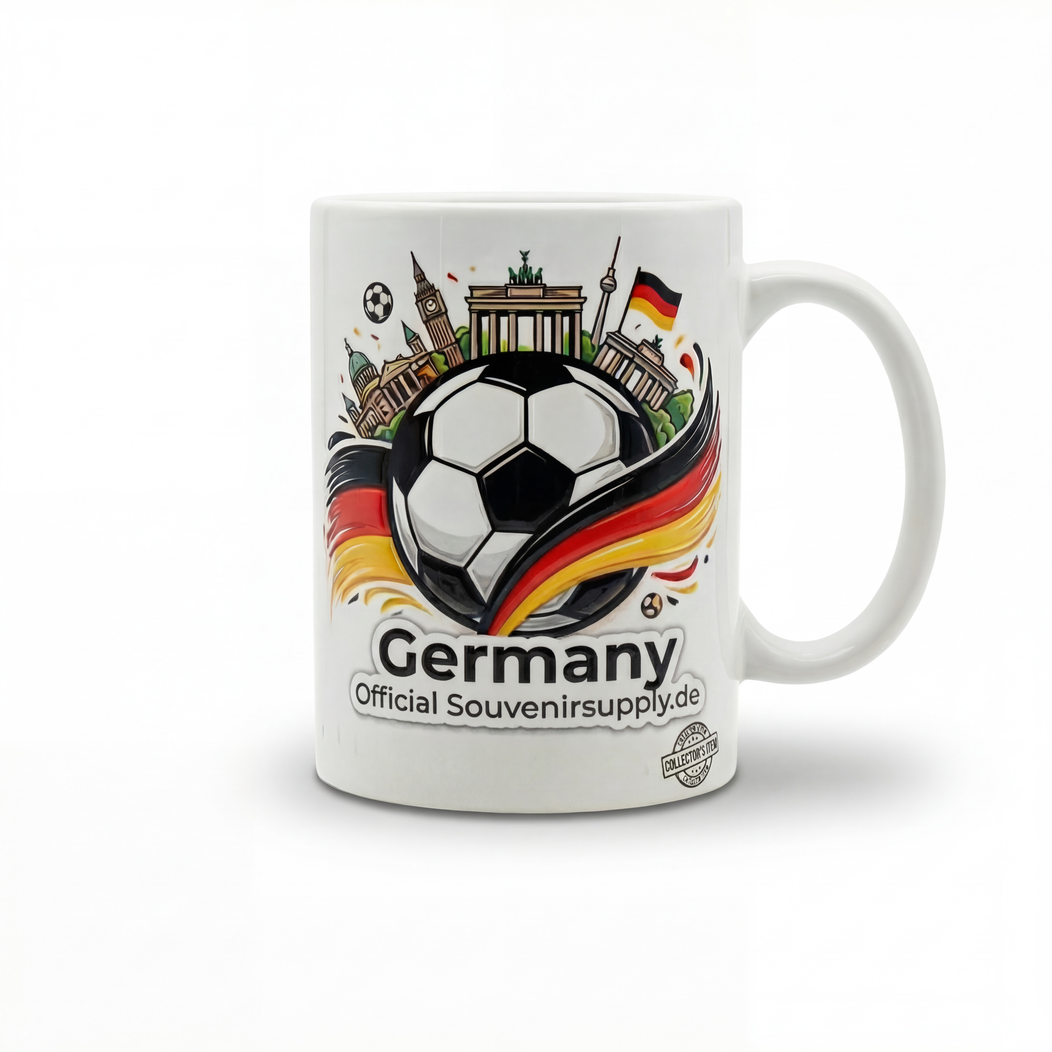 Hochwertige Souvenirtasse, die Leidenschaft für Fußball mit den bekanntesten deutschen Sehenswürdigkeiten optisch verbindet.